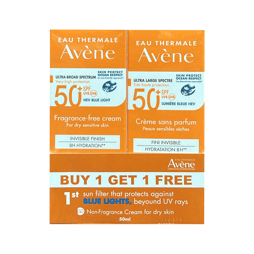 Avene Ultra Broad Spectrum SPF50+ Fragrance Free Cream 8H Hydration 50ml (1+1) آفين كريم واقي من الشمس بعامل حماية +SPF50 – عرض (1+1) بدون عطر